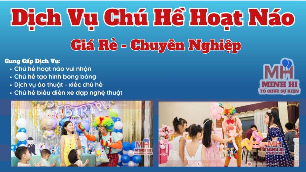 Bạn đang tìm kiếm dịch vụ chú hề hoạt náo giá rẻ chuyên nghiệp cho tiệc sinh nhật, sự kiện công ty hay chương trình thiếu nhi? Sự Kiện Minh Hi mang đến giải pháp hoàn hảo với đội ngũ chú hề giàu kinh nghiệm, vui nhộn, sáng tạo và tương tác linh hoạt cùng khách mời. Chúng tôi giúp không gian sự kiện trở nên sôi động, tràn đầy tiếng cười, tạo dấu ấn khó quên cho mọi bữa tiệc. Các gói dịch vụ tại Minh Hi gồm: